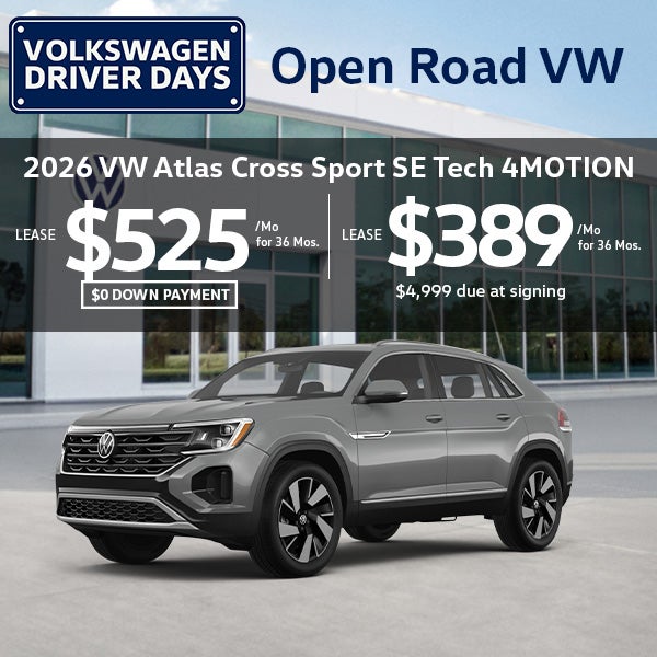 Closed end lease financing available through April 30, 2026 for a new, unused 2026 Atlas Cross Sport SE Tech with 4MOTION®, on approved credit to well-qualified customers by Volkswagen Financial Services through participating dealers. Monthly lease payment based on MSRP of $48,371 and destination charges, less a suggested dealer contribution resulting in a capitalized cost of $41,011.74. Excludes tax, title, license, options, and dealer fees. Amount due at signing includes first month’s payment, customer down payment of $3,911, and acquisition fee of $699. Monthly payments total $14,004. Your payment will vary based on final negotiated price. At lease end, lessee responsible for disposition fee of $395, $0.20/mile over 22,500 miles and excessive wear and use. A $395 fee applies if you purchase your lease vehicle. Offer not valid in Puerto Rico. See your participating Volkswagen dealer for details or, for general product information, call 1-800-Drive-VW. ©2026 Volkswagen of America, Inc.